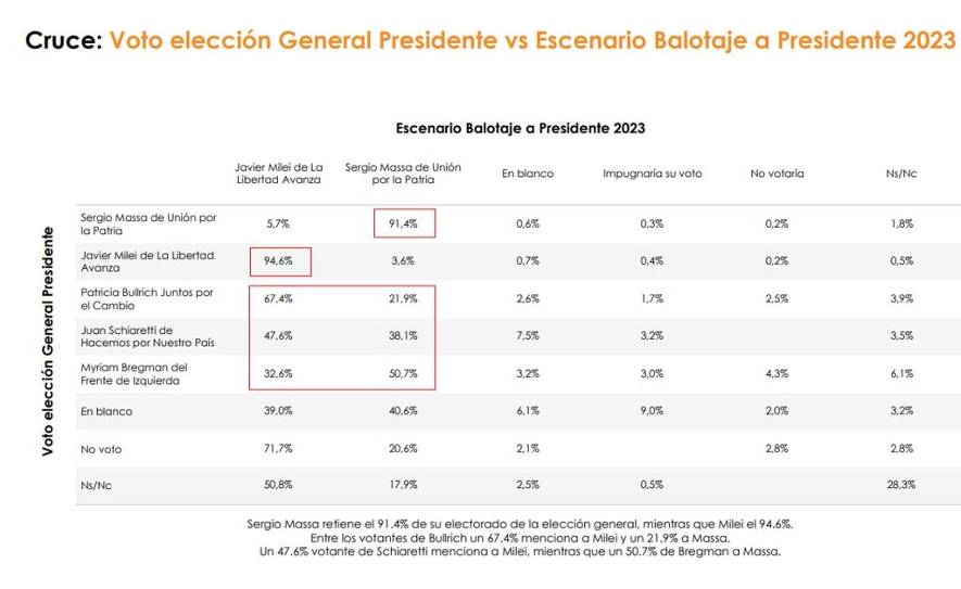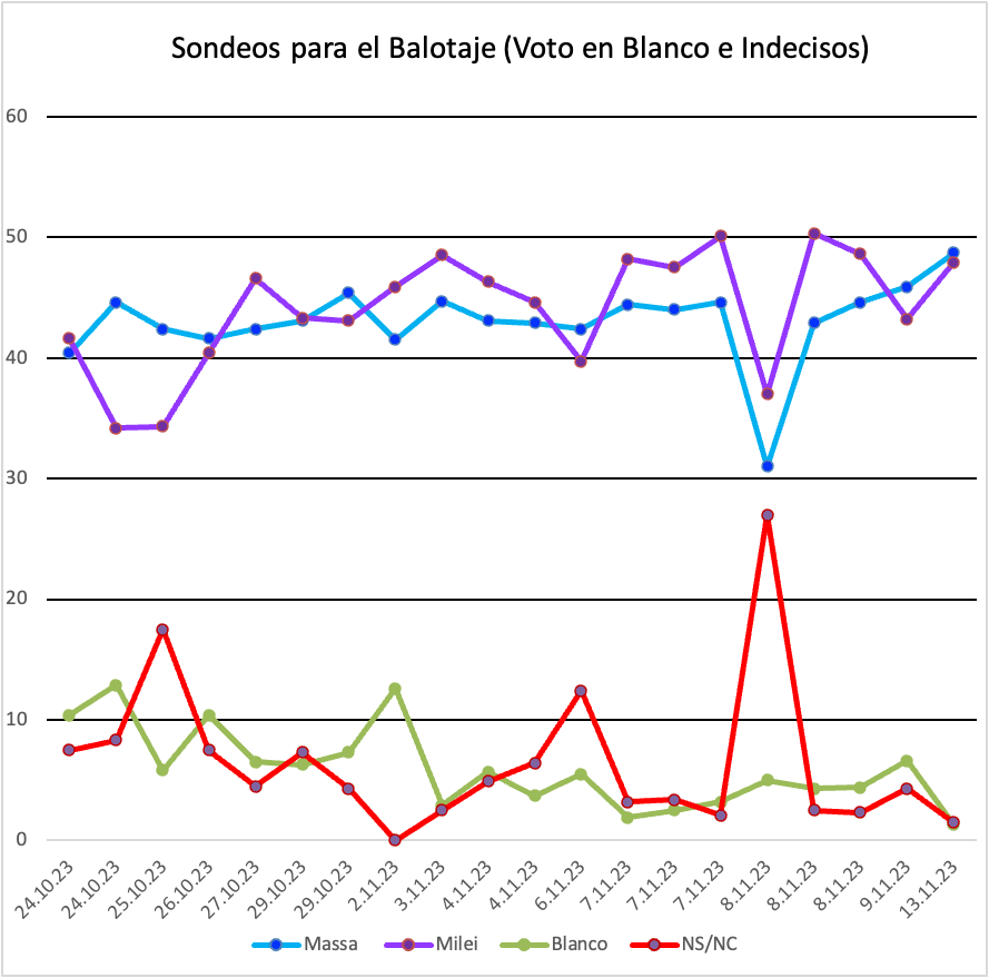 Varias consultoras argentinas otorgan la victoria tanto a Massa como a Milei. Con la suma de todas las encuestas, incluyendo el voto en blanco y los indecisos, la media daría el triunfo a Milei con un 43,62% frente a Massa con un estrecho margen del 43,17%. Los votantes en blanco oscilarían en torno al 6,51% y la opción no sabe/no contesta conseguiría un 6,12%.