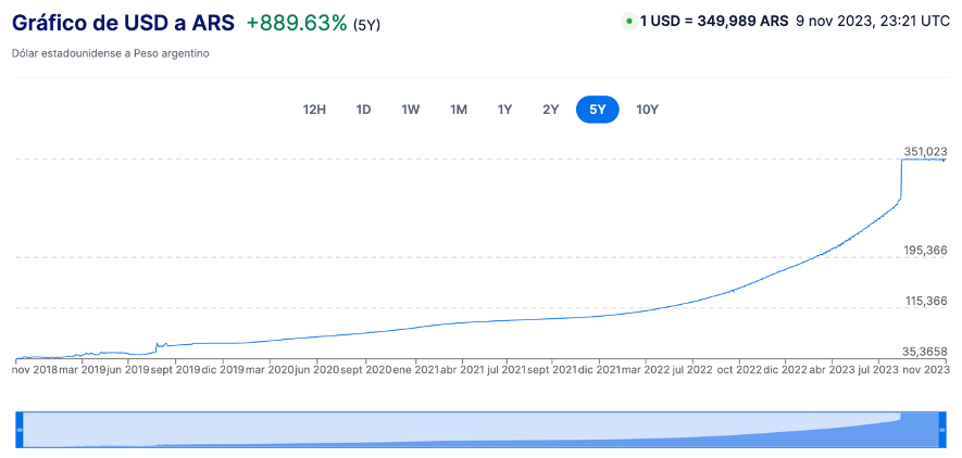 Valor del dólar estadounidense frente al peso argentino (nov.2018-nov.2023). Fuente: Xe Currency (2023)